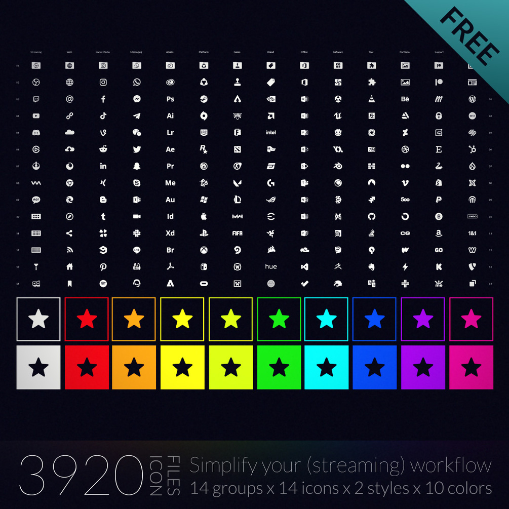 This pack contains 3920 flat icon files (14 groups x 14 icons x 2 styles x 10 colors). Each PNG has a resolution of 72 x 72 px which works specifically well for stream decks.